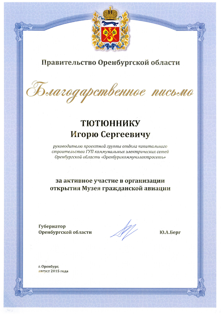 На открытии музея гражданской авиации в г. Оренбурге губернатор Оренбургской области Юрий Берг вручил благодарственное письмо руководителю проектной группы отдела капитального строительства ГУП «Оренбургкоммунэлектросеть» Игорю Тютюннику за активное участие в организации открытия музея.