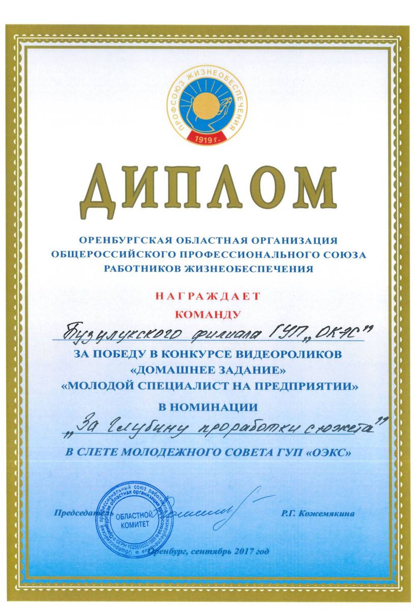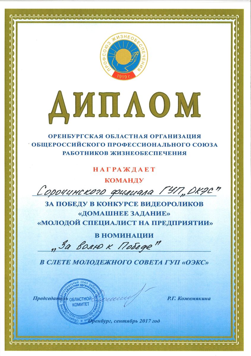 Каждая команда подготовила «Домашнее задание» - видеоролик на тему «Молодой специалист на предприятии». В итоге - диплом победителя вручили команде Абдулинского филиала ГУП «ОКЭС». От обкома профсоюза работников жизнеобеспечения Р. Кожемякина вручила дипломом «За волю к победе» команде Сорочинского филиала ГУП «ОКЭС» и диплом «За глубину проработки сюжета» команде Бузулукского филиала ГУП «ОКЭС», а сертификаты в магазин «Спортмастер» стали приятным дополнением к дипломам.