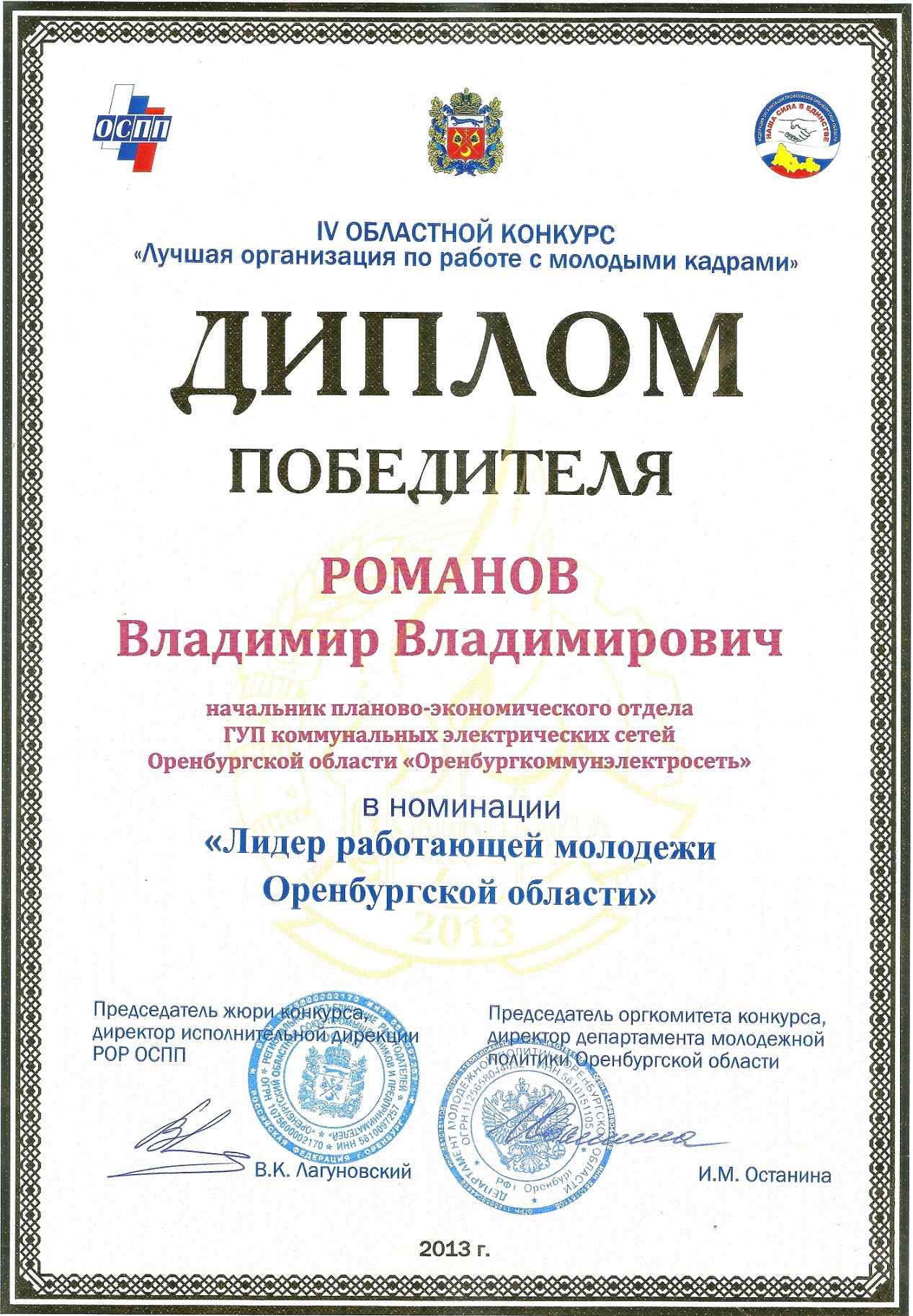 По итогам конкурса жюри подвело итоги, в номинации «Лидер работающей молодежи» победителем стал Владимир Романов – председатель Молодежного совета ГУП «Оренбургкоммунэлектросеть».
