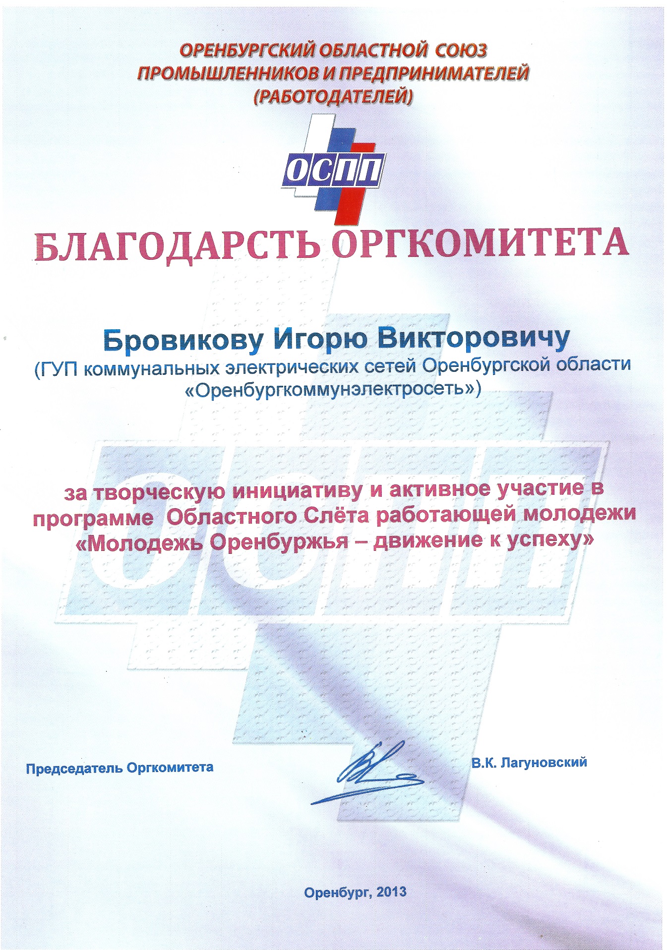 Благодарность оргкомитета за творческую инициативу и активное участие в программе областного слета работающей молодежи «Молодежь Оренбуржья-движение к успеху» объявлена Игорю Бровикову – инженеру ГУП «Оренбургкоммунэлектросеть».
