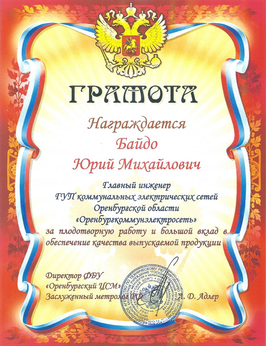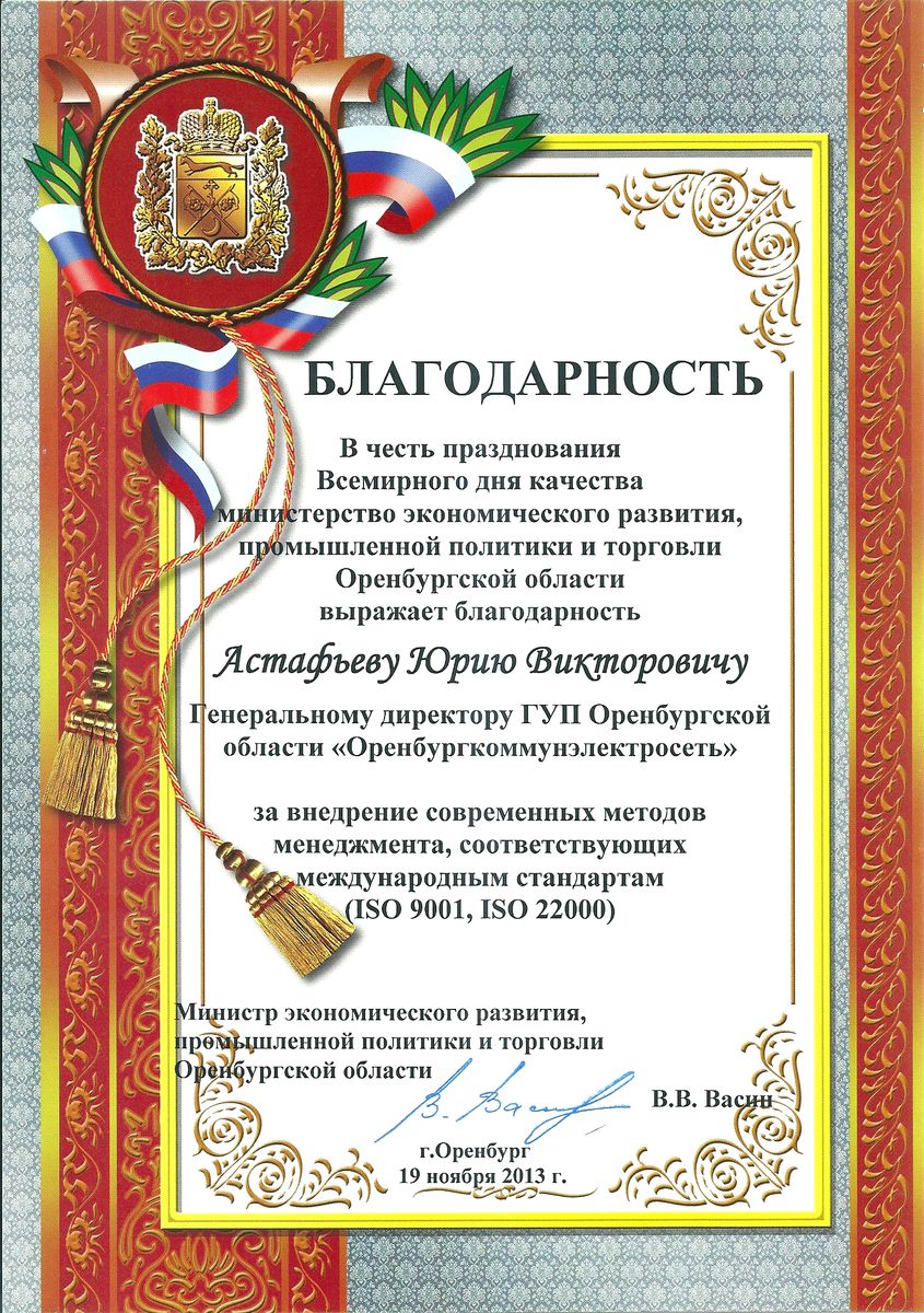На региональной конференции, посвященной всемирному дню качества подвели итоги деятельности предприятий Оренбургской области в этом направлении, министр экономического развития, промышленной политики и торговли Оренбургской области В.В. Васин поблагодарил генерального директора Ю.В. Астафьева и главного инженера Ю.М. Байдо государственного унитарного предприятия коммунальных электрических сетей Оренбургской области «Оренбургкоммунэлектросеть» за работу по внедрение на предприятии современных методов менеджмента, соответствующих международным стандартам (ISO 9001, ISO 22000).Всемирный день качества учрежден Европейской организацией качества при поддержке Организации Объединенных Наций в 1990 году. Это движение призвано не только для демонстрации достижений, но и для привлечения внимания к проблеме качества. Ключом к успеху в деятельности ГУП «Оренбургкоммунэлектросеть» является качество предоставляемых услуг и высокая степень удовлетворенности потребителей. Это отмечено и в благодарности министра.
